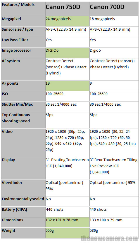 Ниже приведена сравнительная таблица двух зеркалок начального уровня: Canon 750D (Canon T6i в США) и Canon 700D (T5i в США).